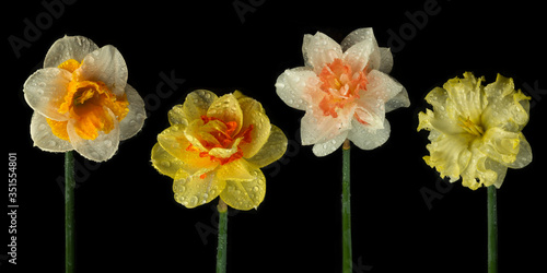 Narcissus flowers on black and colored backgrounds with water drops and particles