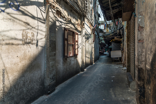 Narrow alley in old grunge dirty street in Yawarat road the China town of Bangkok Thailand