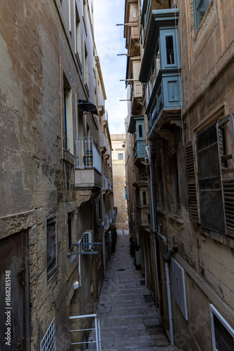 Narrow old streets with windowed buildings and colorful balconies on the streets of Valletta, Malta.
