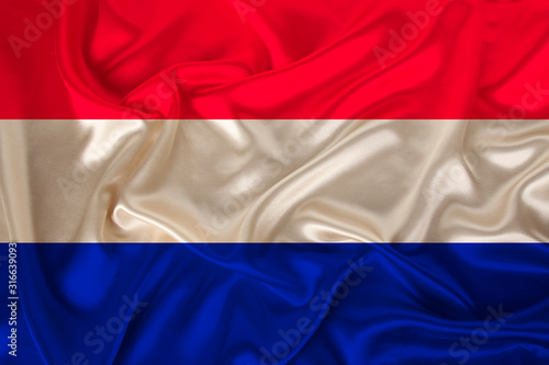 national flag of the country Holland on gentle silk with wind folds, travel concept, immigration, politics, copy space, close-up