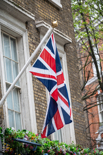 National flag of the United Kingdom is the Union Jack, also known as the Union Flag on houses in central London, UK