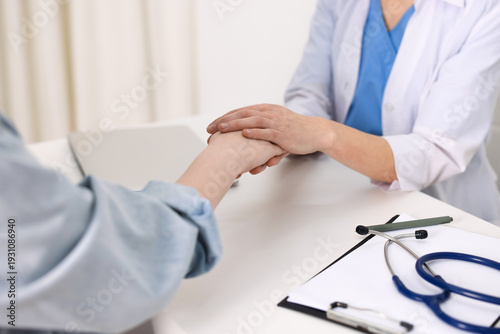 National health service (NHS). Woman having appointment with doctor at white desk indoors, closeup