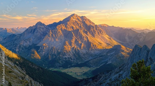 National park scenic landscapes concept. Stunning mountain peak illuminated by sunset glow in a serene landscape.