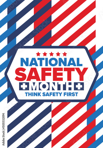 National Safety Month in June. Annual month-long celebrated in United States. Warning of unintentional injuries at work, at home, on the road. Safety concept. Poster, card, banner and background
