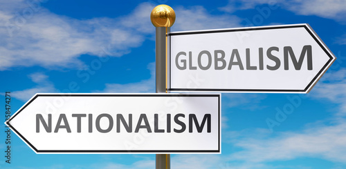 Nationalism and globalism as different choices in life - pictured as words Nationalism, globalism on road signs pointing at opposite ways to show that these are alternative options., 3d illustration