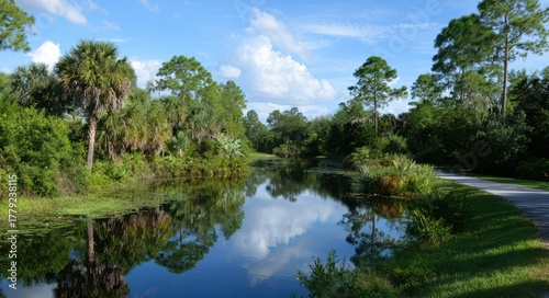Native Florida Plants. Port St. Lucie Botanical Gardens Landscape with River and Sky