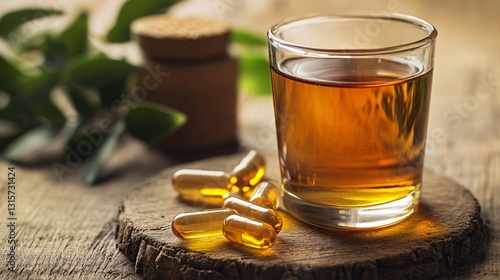 Natural apple cider vinegar supplements next to a refreshing glass of syrupy honey