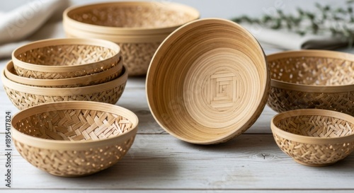 Natural Bamboo Bowls Set Assortment, Handwoven Craftsmanship, Rustic Kitchenware, Eco-Friendly Storage