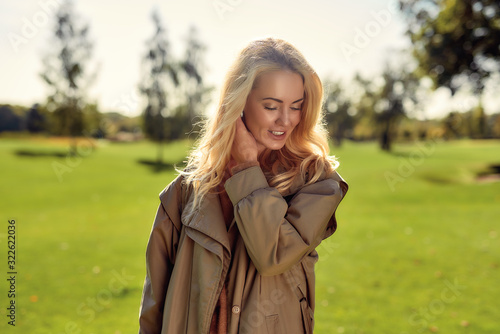 Natural beauty. Portrait of young and attractive woman in beige cloak smiling and enjoying time in the park