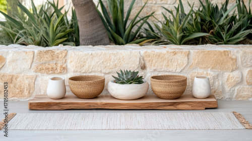 Natural decor, wooden tray, woven baskets, succulent plant, minimalist design