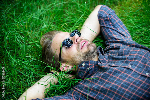 Natural freshness. Man bearded hipster united with nature. Nature fills him with freshness and inspiration. Guy happy and peaceful enjoy freshness of grass. Man unshaven guy lay on green grass meadow
