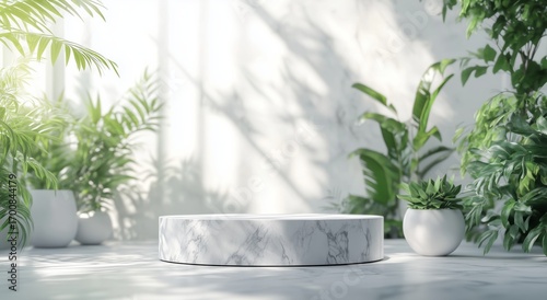 indoor, space, marble, platform, plant, greenery, natural, light, decoration, serene, atmosphere, circular, white, pot, home, interior, design, relaxation, nature, high-coloured, bright, elegant, modern, minimalistic, tropical, planning, fresh, aesthetic, calm, colours, contemporary, environment