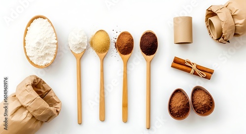 baking, cooking, ingredient, natural, food, flour, spice, cinnamon, dried, fruit, wooden, spoon, flat, lay, overhead, view, white, background, healthy, eating, organic, raw, culinary, preparation, kitchen, photo, rustic, texture, sweetener, date, cocoa, sugar, spice, blend, styling, epicure, artisanal, resource