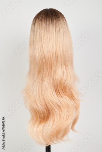Natural looking blonde wig on white mannequin head. Long hair on the plastic wig holder isolated on white background, back view.