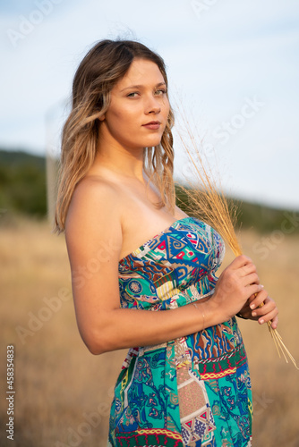 Natural Looking Young Beautiful Woman with Hazel eyes posing in the fields, no post editing