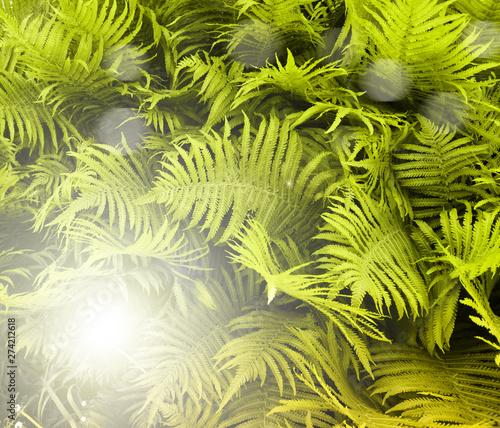 Natural pattern of green leaves of a fern. Exotic natural background. View from above.