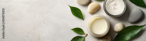 Natural skincare cream in a jar with smooth stones and green leaves on a light background, promoting wellness and beauty.