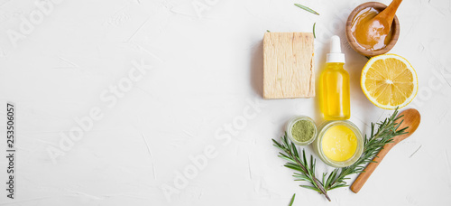 Natural skincare ingredients with manuka honey, lemon, essential oil, clay, balm, rosemary herbs and natural soap with copy space