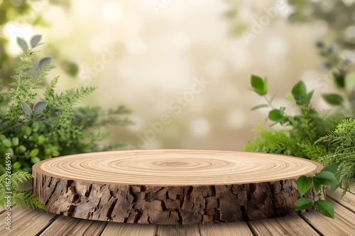 Natural wood slice podium surrounded by lush greenery and soft bokeh background