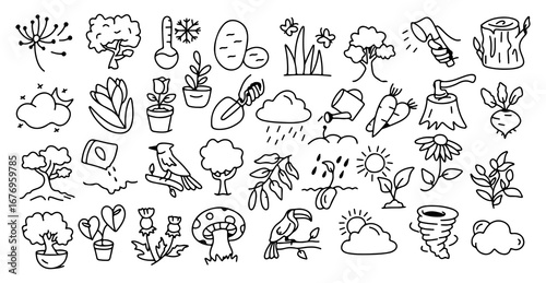 nature, gardening, plant, tree, flower, weather, eco, outline, minimal, hand-drawn, garden tool, vegetable, farming, agriculture, sustainability, organic, environment, growth, leaf, cloud, sun, rain, storm, tornado, watering can, shovel, axe, stump, mushroom, bird, toucan, carrot, beetroot, germ bud, line art, doodle, vignetting, monochrome, black-and-white, landscape, forest, botanical, ecology, spring