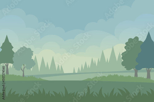 Nature's green landscape with trees, mountains, and sky, illustrating a summer meadow or spring field scene