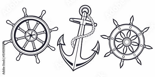 Nautical themed art featuring ship wheels and anchor for maritime designs and sea adventures theme vector design