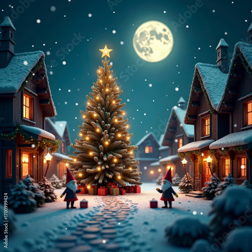 christmas, tree, vacation, decoration, christmas tree, celebration, fir, winter, gift, pine, new year, star, snow, house, landscape, evening, card, illustration, vector, village, snowflake, season, cold, santa, new, blue, heaven