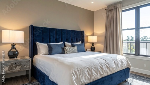 Navy and Beige Hotel Suite With Velvet Headboard