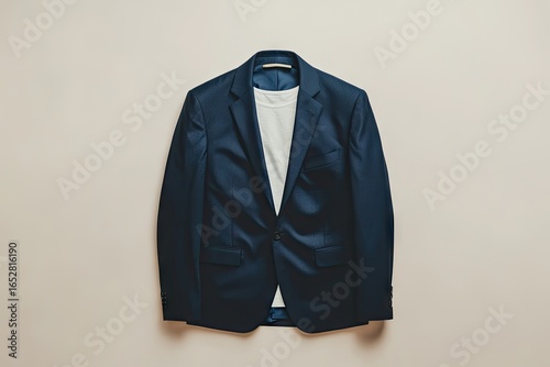 suit, jacket, blue, white, t-shirt, clothing, formal, fashion, dress, wear, style, top, buttoned, layered, accessory, clothes, casual attire, professional, elegant, modern, image, photo, studio, light, background, neutral, colours, design, detail, product, presentation, hanging, item, textile, fabric, smooth, texture, quality, detail, buttons, collar, sleeve, simple, clean