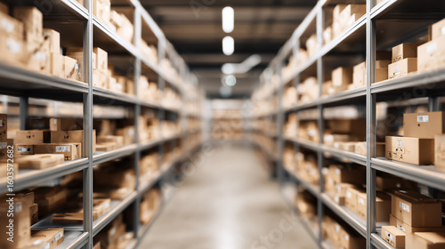 Neatly arranged boxes on warehouse shelves with soft overhead lighting and a blurred background.