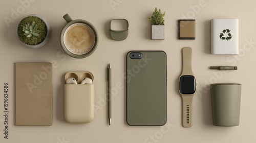 accessory, olive, green, beige, organisation, tech, minimal, wireless, pen, trendy, stylish, innovative, relaxation, desktop, chic, elegant, calm, notebook, productivity, office, daily, portable, environmentally friendly, comfortable, compact, setup, phone, neutral, workspace, modern, contraption, digital, clean, succulent, lifestyle, design, creative, earbud, plant, essential, topview, background, natural, cup, hot drink