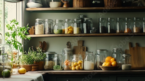 Neatly Arranged Pantry with Glass Jars, Fresh Ingredients, and Kitchen Essentials
