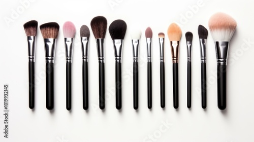 Neatly lined makeup brushes on white surface, each casting distinct shadows, illustrating precision and the tools of artistic transformation.