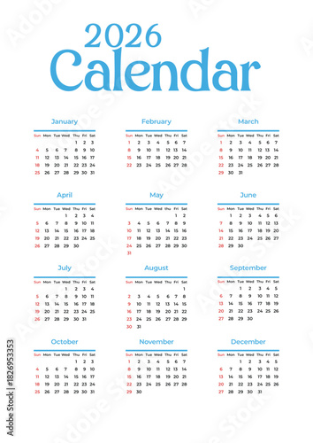 Neatly organized 2026 calendar with all months in grid layout, Sundays and holidays highlighted – practical yearly planner and elegant calendar design JPG