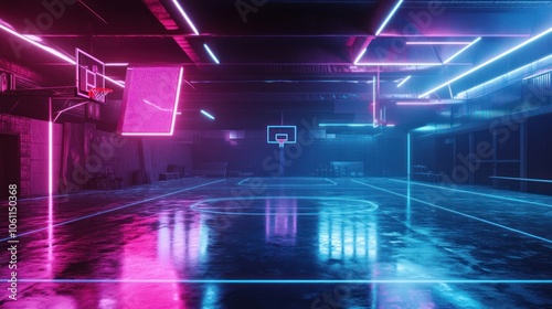 basketball, court, neon, light, blue, pink, glow, night, sport, game, arena, indoor, competition, play, team, hoop, rim, floor, line, reflections, bright, dark, futuristic, abstract, modern, graphic, design, minimal, geometric, architecture, interior, structure, energy, dynamic, high-coloured, vibrant, colours, digital, art, style, mood