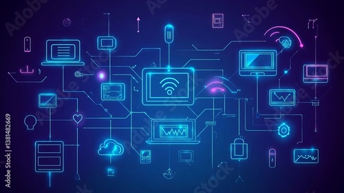 network, diagram, neon, blue, device, laptop, computer, cloud, wi-fi, connection, datum, technology, digital, cyberspace, icon, symbol, glowing, abstract, futuristic, communication