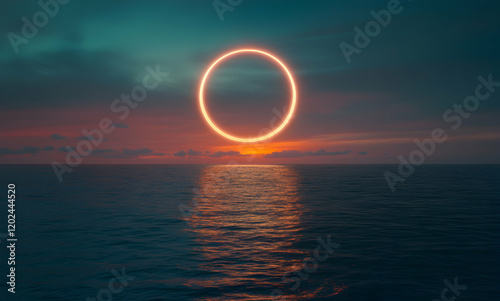 Neon Circle Sunset over Calm Ocean: A Serene and Mystical Seascape