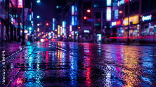 Neon City Lights Rain Reflection Urban Night. Vibrant neon city lights reflecting on wet rainy street creating colorful abstract urban nightscape atmosphere