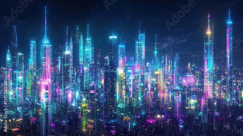 city, skyscraper, night, neon, light, futuristic, urban, metropolis, modern, building, architecture, digital, technology, glow, illuminated, vibrant, colourful, electric, energy, bright, scene, landscape, skyline, city landscape, artwork, graphic, design, illustration, abstract, fantasy, dreamlike, cosmos, star, night time, future, progress, innovation, science fiction, earth, global