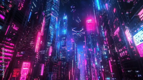 Neon Cityscape with Flying Drones