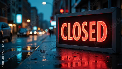 Neon "CLOSED" sign glowing on rainy street at night, urban atmosphere
