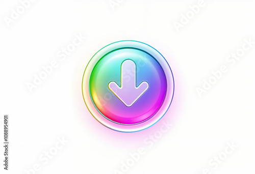 neon download icon glowing multicolor vibrant design technology symbol modern interface design digital content transfer user-friendly experience isolated on white background