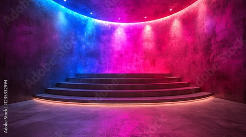 stair, neon, light, pink, blue, purple, curve, step, illuminated, glow, colours, vibrant, night, abstract, modern, architecture, design, interior, futuristic, stage, background, scene, artistic, dramatic, stylish, colourful, energy, bright, shadow, dark, textured, wall, room, space, concrete, gradient, lighting, atmosphere, aesthetic, visual