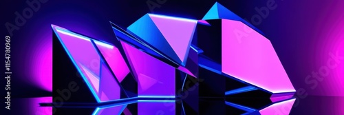 Neon geometric shapes, abstract triangles, vibrant blue and purple, futuristic landscape, glossy surfaces, sharp edges, 3D render, synthwave aesthetics, dynamic composition, high contrast, ultraviolet