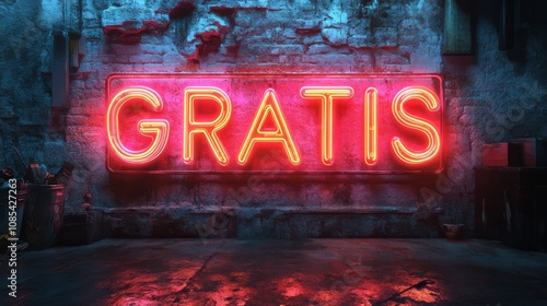 Neon "Gratis" Sign: A vibrant neon sign, glowing brightly against a gritty urban backdrop, creates a captivating visual with the word "Gratis" shining in bold red letters.
