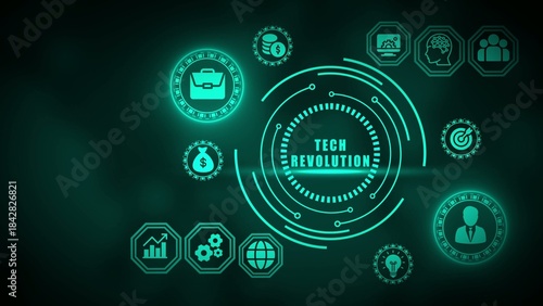 dark background, business, finance, technology, innovation, futuristic, digital, symbol, briefcase, money bag, graph, gear, globe, light bulb, target, people, brain, computer-screen, neon, green, tech, revolution, dark