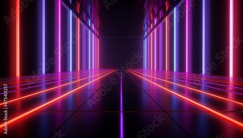 Neon light background pattern in red blue and pink, as a mirror room, vertical lines, modern design on a dark background