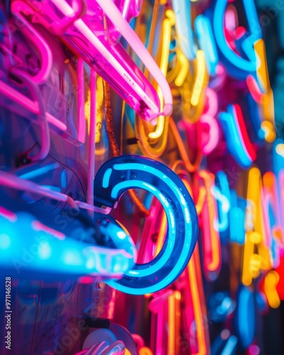 neon light signs, featuring vibrant colors like pink, blue, and yellow against a dark background