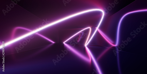 Neon lights, glowing lines, ultraviolet, vibrant colors, abstract background. 3D illustration.