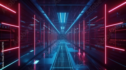 server, room, corridor, digital, futuristic, neon, light, technology, datum, center, network, computer, hardware, system, glow, pink, blue, red, purple, bright, modern, science, fiction, virtual, reality, machine, electric, energy, innovation, architecture, design, abstract, glowing, illuminated, line, interior, aesthetic, style, reflective, space
